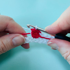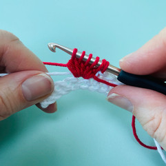 5-tr cl With Red, (yo, insert hook into st, yo and pull up a loop, yo and pull through 2 loops) 5 times working into the same st, with White, yo and pull through all 6 loops on hook.